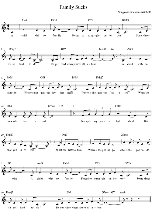 A Child with No Family[Names withheld] Young people attending the Margules Music Therapy Program at the Turtle Bay Music School, a private independent music school in New York City, composed the song in this section. When I spoke with its director, Diane Snow Austin, the program served adolescents who were separated from their birth parents and were living either in group homes or foster care. The reasons for separation ranged from child abuse or neglect to the death or incarceration of one or both parents. All of the kids in the program experienced emotional disabilities, including chronic low self-esteem, depression, and anxiety. They were considered to be at risk for drug use, teen pregnancy, and antisocial behavior. Some also had learning disabilities and attention deficit disorder. The long-term aim of the program was to unite the young people with their birth parents or, at the least, another family member. Diane Austin encountered anger and distrust in her students when she first established the program. Over time, however, with music as a tool, she was able to foster enough trust among the kids for them to begin the slow process of opening up to her, to each other, and to their own painful emotions. The song included here was composed by three girls between the ages of fifteen and nineteen. One of the girls didn’t know who her father was, had not spoken to her mother for ten years, and had been sexually abused repeatedly since she was five or six. Another girl’s mother was in jail and had not been heard from for some time. The third girl’s mother had remarried, and the daughter felt unwelcome in her mother and stepfather’s home. She said that she and her mother had “disagreements,” which Diane told me probably meant she had been abused, possibly by her mother’s new husband. The girls wrote this around the winter holidays. With no families to go home to, they were in a low mood. Diane invited them to talk about what was on their minds, urging them to put those feelings into lyrical form. One girl proposed the title, another came up with the first line, another with the second line or two, and so forth. Diane picked out chords on the piano. As the girls began singing along, they found their own melody and rhythm, and the song that follows emerged.