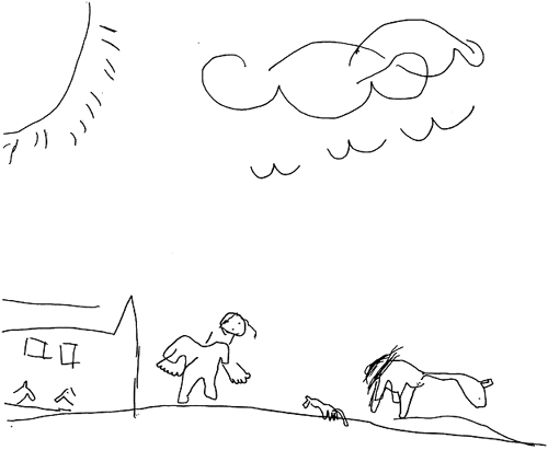 Drawing by Luis Marquez. In Luis’s words, “This is a picture of Windrush Farm. It’s where I learned to ride horses. This is a barn with two horses, the sun, the clouds, the birds, a boy, a dog, and a horse.” Click here to read a description of this drawing