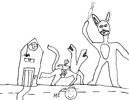 Drawing by Kenneth. From left to right, we see a subway station with a spider, an animal (or two?) that Kenny is riding, and all the way on the right is a “big bunny rabbit,” which Kenny also refers to as Bugs Bunny. At the bottom of the drawing (as labeled) is Kenny’s face. Click here to read a description of the above drawing