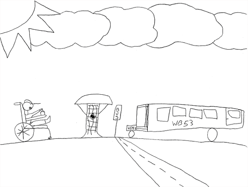 Drawing by Kenneth. This drawing shows Kenny getting picked up by the bus that drives him to school every day. The bus’s insignia, “WB53,” stands for “wheel bus fifty-three,” and the door you see near the back of the bus is where Kenny boards, since that’s where the wheelchair ramp is. Across the road (Kenny was proud of having learned to draw a road in “three-D”) is a tree with a “squirrel hole” and then Kenny himself “yellin’ for the bus.” “I open my mouth w-i-d-e, like, ‘Waaait!’ And it’s about to leave, see? One time that happened to me, y’know? My bus almost left me and I hadda chase it down the parking lot.” Click here to read a description of the above drawing