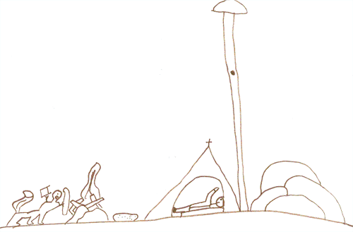 Drawing by Kenneth. This drawing depicts the players in Kenny’s tale of adventure on Squirrel Island. From left to right: The Squirrel holding the hotdog and the cup; the campfire; the hotdog bun; Kenny in the tent; the tree with its hard-to-reach squirrel hole; and rocks. While drawing this picture, Kenny expanded on his original tale: Instead of just one squirrel, he said, “There were two of ‘em! One carried the hot dog; one carried the drink. And they went up in the tree. Then one came down and took the bun, and I was, like, ‘I’ll get you!’ And then he threw it down all chewed up.” Describing the campfire, he said, “Some of the kids from last year, they left socks and stuff like that.” He and his fellow campers threw the socks in the fire, he said, and cooked their dinner over it. “We cooked hard-boiled eggs. But guess what. They weren’t boiled all the way. That’s how I got egg on my head!” Click here to read a description of the above drawing